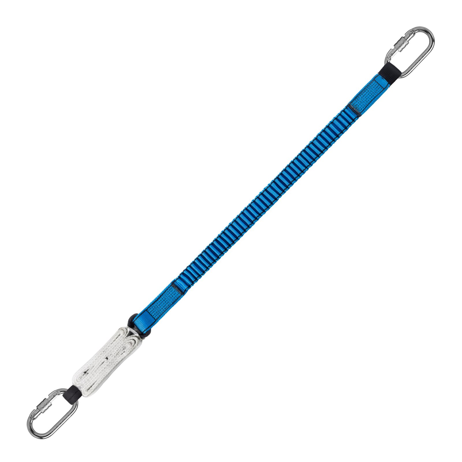 - Dispone de distintos ganchos fijos de acero, aluminio o dieléctricos según su versión, injeridos en la gaza del ramal de cinta y de un mosquetón de acero de cierre de virola de rosca en la gaza del paquete absorbedor.